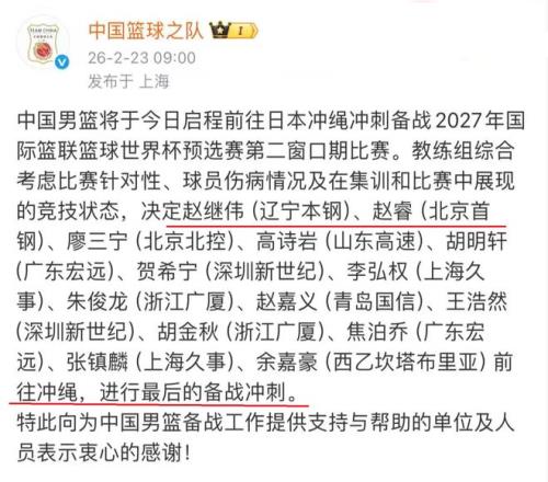 今天早上,中国男篮公布了一则重要消息,没错,那就是2027世界杯预选赛,第二窗口期的参赛球员,已经是基本出炉,此番,郭士强一共带了14名球员前往日本,准备2月26日与日本队的比赛。郭士强之所以会带14名球员前往,有一个重要因素,就是给球队阵容,做更加充分地准备。