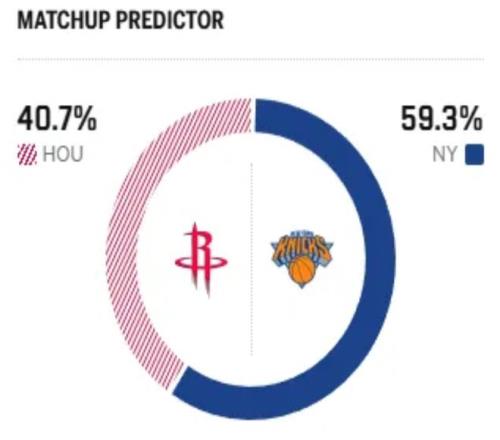 赛前,美媒ESPN对本场比赛进行了胜率预测,火箭队胜率仅有40.7% ,而尼克斯胜率则为59.3% ,稍占优势 。