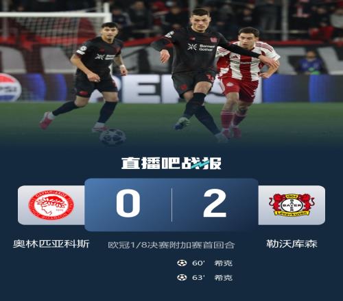 体育播报2月19日宣 北京时间2月19日凌晨4:00,欧冠1/8决赛附加赛首回合勒沃库森做客卡雷斯卡基斯体育场对阵奥林匹亚科斯。上半场,帕拉西奥斯射门击中门框,波库失单刀,卡埃比头球破门因越位被吹!半场战罢,勒沃库森暂0-0奥林匹亚科斯;下半场,希克三分钟内连入两球为勒沃库森取得领先!全场比赛结束,勒沃库森2-0奥林匹亚科斯!