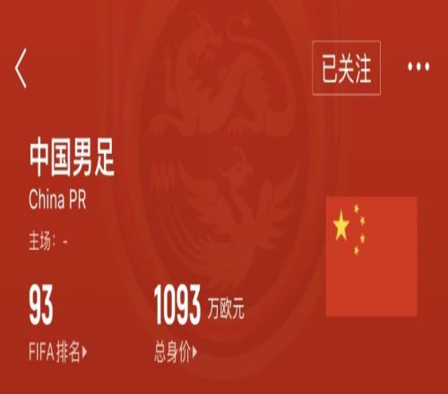 最新一期FIFA国家队排名中,西班牙排在第一位,最新一期国家队身价11.5亿欧;中国队排在第93位,队伍身价为1093万欧。