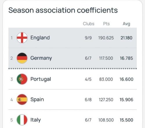 本赛季打到了三分之二,各项赛事的争夺奖杯、和资格争取情况越发激烈,不过也越发的明确。其中、欧战积分资格对比,是各家联赛发挥情况的重要象征,这也是接下来新赛季名额争夺的重要保障。目前来看,英格兰联赛已经确定能百分百的保证拿到前二的资格(多一个资格),他们至少会有一个额外欧冠名额到手,也就是赛事的前5名,都能打这项赛事。