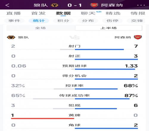 体育播报2月19日宣 在英超阿森纳对阵狼队的比赛中,上半场结束阿森纳暂时1-0领先,以下为双方半场数据对比: