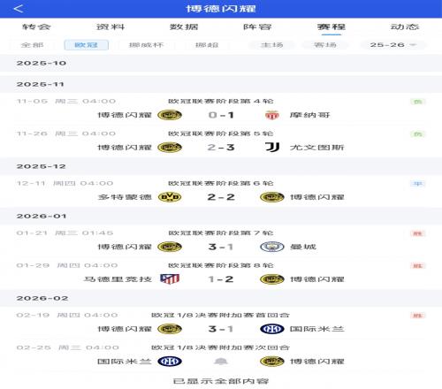 体育播报02月19日宣 欧冠1/8决赛附加赛首回合,国米1-3不敌博德闪耀。博德闪耀近4场欧冠保持不败且接连战胜曼城、马竞以及国米。