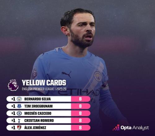英超第27轮,曼城主场2-1击败纽卡斯尔联,曼城队长伯纳多-席尔瓦因犯规染黄,至此,伯纳多-席尔瓦本赛季英超已领到8张黄牌,追平个人单赛季英超最多纪录。